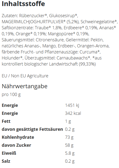 Fruchtige Leichtigkeit trifft auf samtigen Joghurtgenuss – die soften Jo-Frutti Schaumzucker in Beerenform und BIO-Qualität bieten eine himmlische Kombination aus schaumig-weicher Konsistenz und dem vollen Geschmack cremiger Joghurtfrüchte.Inhalt: 9 gFüllung: BIO JO-Frutti WerbetüteGeschmack: FruchtmixFormat: 70 x 90 mmFolie: weiße oder transparente Folie mit WeißunterlegungDruck: 4c EuroskalaVerpackungseinheit: 400 StückHaltbarkeit: ca. 10-12 Monate bei sachgerechter LagerungLieferzeit: ca. 15 Arbeitstage nach DruckfreigabeMindestbestellmenge: 3.000 Stück