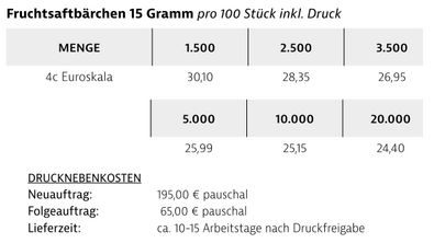 Preisliste Fruchtsaftbärchen 15g mit Logo Details