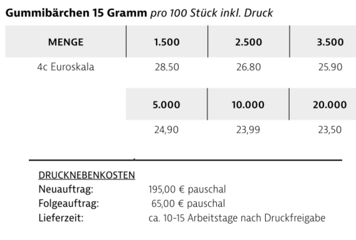 Preisliste Gummibärchen mit Werbedruck 15g mit Logo Details