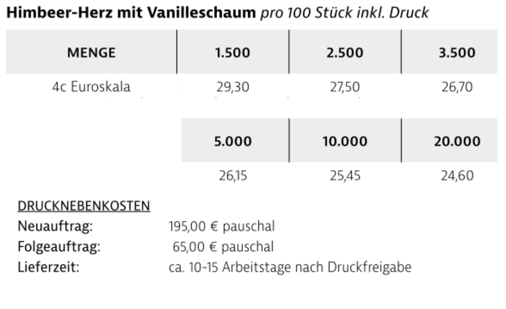 Preisliste Himbeer-Herzen mit Vanilleschaum im Flowpack mit Logo Details