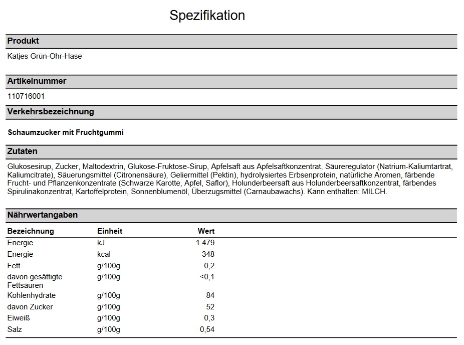 Preisliste Fruchtgummi Katjes Grün-Ohr Hase in Werbetütchen 16g mit Logo Details