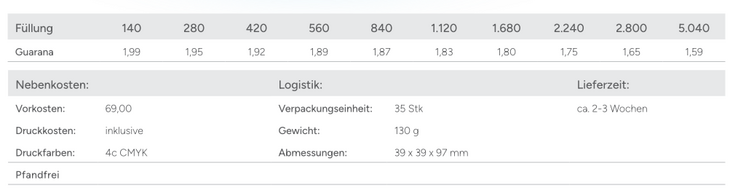 Verpackung: 60 ml Shot (Glas, pfandfrei)Füllung: Energy GuaranaDruckart: Offset digitalDruckfarben: 4c (CMYK)Volumen: 60 mlAbmessungen: 39 x 39 x 97 mmHaltbarkeit: ca. 16 Monate bei sachgerechter LagerungMindestbestellmenge: 140 StückLieferzeit: ca. 2-3 Woche ab Druckfreigabe
