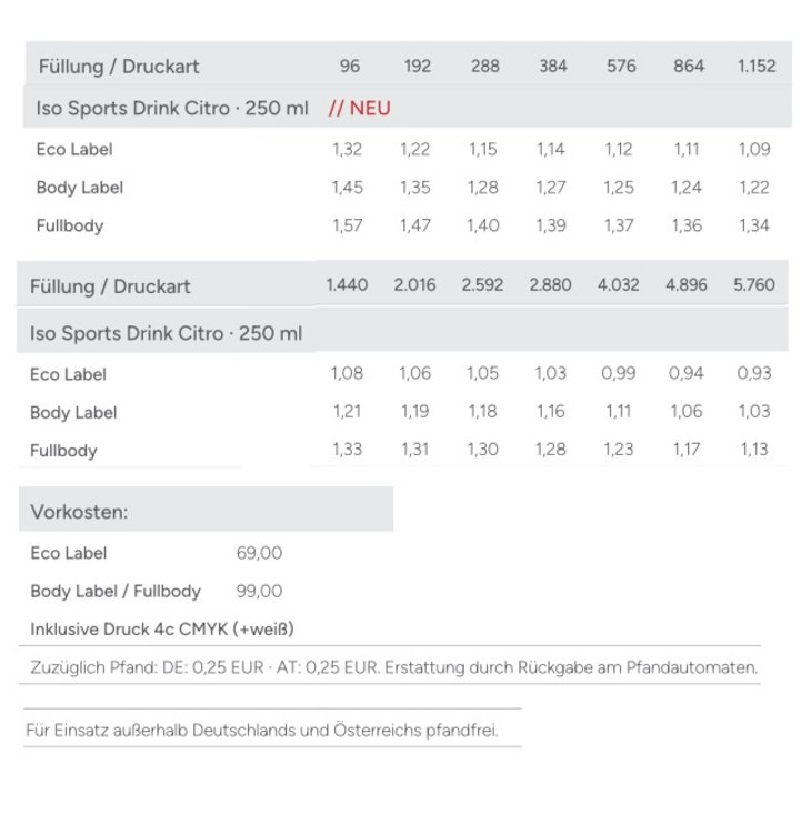 Preisliste (€) Iso Sports Drink Citro 250 ml mit Logo Details