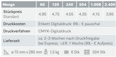 Original Nürnberger Christkindles Glühwein in olivgrüner 1,0L Bordeauxflasche mit schwarzem Schraubverschluss, hergestellt aus Rotwein, verfeinert mit natürlichen Aromen und feinen Gewürzextrakten Alkohol ca. 10 % Vol.Beschreibung: Original Nürnberger Christkindles Glühwein in olivgrüner 1 L BordeauxflascheInhalt: 1,0l GlühweinMaße: ø 75 mm x 285 mmDurcktyp: CMYK-DigitaldruckBedruckung: Standard Folien-Etikett weißLieferzeit: ca. 3 Wochen / bei Express: i.d.R. 1 Woche (99,- € Aufpreis)Mindestbestellmenge: 60 Stück