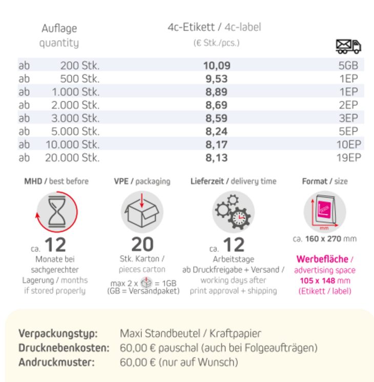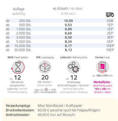 Produkt: Maxi Standbeutel / KraftpapierInhalt: Bohnenkaffee 250gFormat: ca. 160 x 270 mm Druck: DigitaldruckWerbefläche: 4c-Etikett 105 x 148 mm Lieferzeit: ca. 12 Arbeitstage ab Druckfreigabe + VersandVPE: 20 Stk. / KartonHaltbarkeit: ca. 12 Monate bei sachgerechter LagerungMindestbestellmenge: 200 Stck.