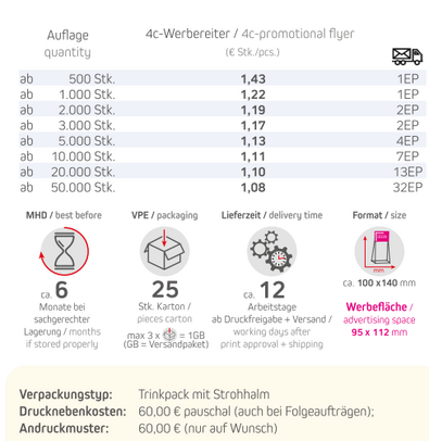 Produkt: Capri Sonne Trinkpack mit Strohhalm und eigenem LogoInhalt: Capri-Sun Multivitamin 200mlFormat: ca. 100 x 140 mmWerbefläche: 4c-Werbereiter 95 x 112 mm Lieferzeit: ca. 12 Arbeitstage ab Druckfreigabe + VersandVPE: 25 Stk. / KartonHaltbarkeit: ca. 6 Monate bei sachgerechter LagerungMindestbestellmenge: 500 Stück