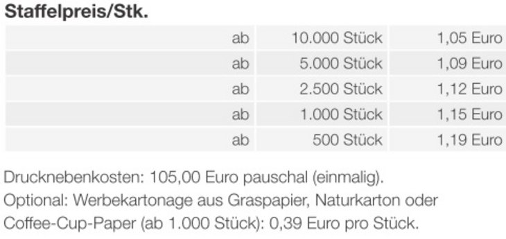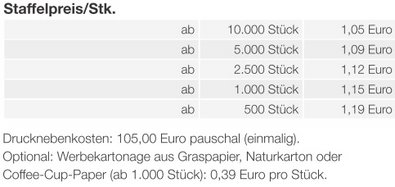 waterdrop ® – Erfrischung im Mini-Format! Kleiner Drop, große Wirkung! Der innovative Microdrink von waterdrop ® verwandelt pures Wasser in ein köstliches Geschmackserlebnis – ganz ohne Zucker, künstliche Zusätze oder Plastikflaschen. Wählen Sie zwischen den beliebten Sorten Brombeere oder Eistee Zitrone und bringen Sie frischen Genuss in jede Pause. Produktdetails: Werbekarte mit einem waterdrop ®Bedruckung: 4-farbiger Druck auf grafischem Premium-Karton (FSC ® -zertifiziert). Optional auf Graspapier, Naturkarton oder Coffee-Cup-PaperFormat: ca. 95 x 65 x 18 mmVerpackung: 225 Stück pro Karton, 12.150 Stück pro PaletteInhalt: 1 waterdrop ® . Würfel in 400 - 600 ml Wasser auflösen lassen und erfrischend fruchtig genießenGeschmacksrichtungen: Brombeere oder Eistee Zitrone. Bitte bei der Bestellung mit angebenHaltbarkeit: 12 MonateLieferzeit/Zubehör: ca.15 Arbeitstage nach Druckfreigabe.Mindestbestellmenge: 500 Stück