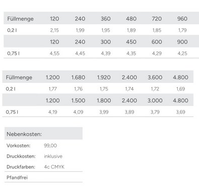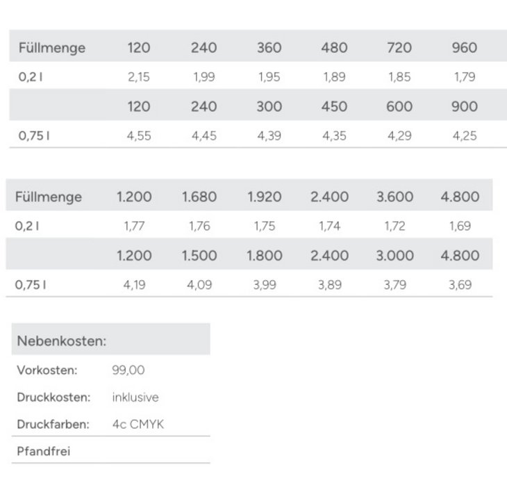Inhalt: Secco IGT Perlwein 200ml oder 750mlVerpackung: 0,2l Glas oder 0,75l GlasDruck: BodyLabel, matt Kapselfarbe nur bei 0,2 Flasche: wei0, gold, silber, schwarz, blau oder rotHerkunft: Venetien - ItalienHaltbarkeit: Kein MHDVolumen: 200 ml oder 750 mlMindestbestellwert: 120 StückMerkmale: Trocken / veganVerpackungseinheit: 6 stehend im Karton 0,75l oder 12 stehend i.K 0,2lAlkohol: 10,5%Lieferzeit: ca. 2-3 Wochen ab DruckfreigabePfandfrei