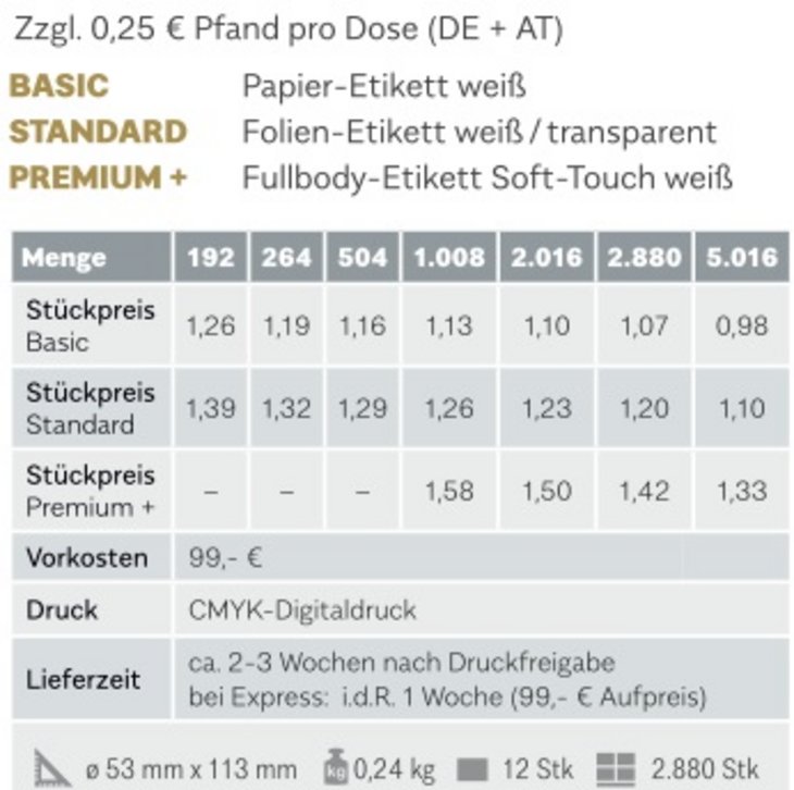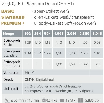 Perlwein mit zugesetzter Kohlensäure. Prickelnd, spritzig und frisch! Alkohol ca. 10% Vol.Slimline Dose in Silber.Artikel: Promo Secco spritzig-erfrischend (Alkohol 10% Vol)Maße: ø 53mm x 113mmInhalt: 200 mlGewicht: 0,24 kg pro StückVerpackung: Slimline Dose in silber (24er Tray)Druck: CMYK-DigitaldruckBasic: Papier-Etikett weiß Standard: Folien-Etikett weiß / transparentPremium: Fullbody-Etikett weiß / transparentPremium + Fullbody-Etikett mit Soft-Touch: weiß / transparentLieferzeit: ca. 3 Wochen nach DruckfreigabeEXPRESS: i.d.R 1 Woche Lieferzeit (99 Euro Aufpreis)Mindestbestellmenge: 264 Stück