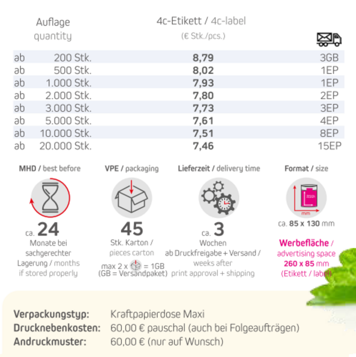 Preisliste Beuteltee Minze in Biologisch abbaubarer Eco Pappdose Maxi mit Logo Details