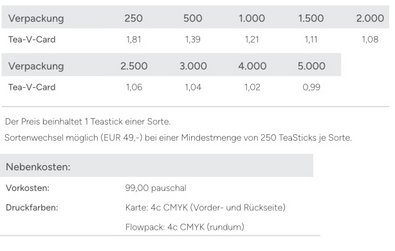 Die abtrennbare Visitenkarte mit Bio TeaStick eignet sich nicht nur für den Kundenbesuch,sondern auch für unzählige andere Gelegenheiten wie Messen und Infostände! Der Tea-V-Card lässt sich mit TeaSticks im edlen "Premium Selection"-Design oder mit Ihren ganz indivduell verpackten TeaSticks bestücken.