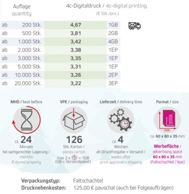 Preisliste Bio Beuteltee Winterpunsch 5 Stück Faltschachtel mit Logo Details