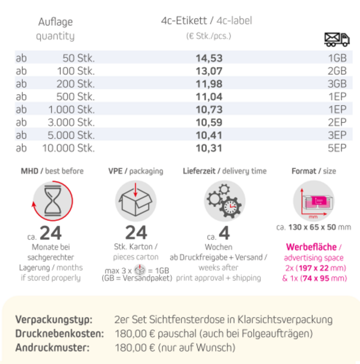 Verpackungstyp: Metalldose Mini mit Sichtfenster / MetallFarbe: silber oder schwarzTeesorten nach Wahl, Nicht-Bio oder Bio: 25g Schwarztee, Art.-Nr. 0253617g Kräutertee Harmonie, Art.-Nr. 0269519g Matetee Orange, Art.-Nr. 0269715g Kräutertee Lavendel, Art.-Nr. 0269820g Kräutertee Bergtee & Zietrone, Art.-Nr. 0269918g Bio Grüner Tee mit Minze, Art.-Nr. 0253130g Bio Früchtetee Gute Laune, Art.-Nr. 0253215g Bio Kräutertee Vierjahrszeiten, Art.-Nr. 0253425g Bio Kräutertee Glücksgefühl, Art.-Nr. 0253525g Bio Rotbuschtee Entspannungszeit, Art.-Nr. 0269417g Bio Kräutertee Seelenwohl, Art.-Nr. 02696Format: ca. 130 x 65 x 50 mmDruck: Digitaldruck Werbefläche: 4c-Etikett 2 Seiten: 197 x 22 mm und 1 Seite: 74 x 95 mm Lieferzeit: ca. 3-4 Arbeitswochen ab Druckfreigabe + VersandVPE: 24 Stk. / KartonHaltbarkeit: ca. 24 Monate bei sachgerechter LagerungMindestbestellmenge: 50 Stck.