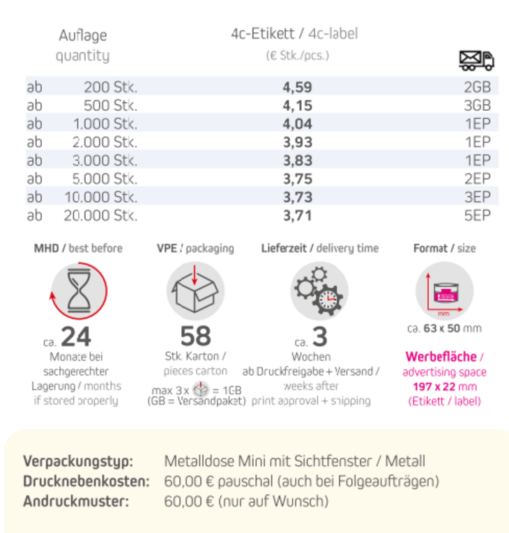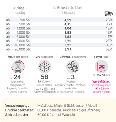 Verpackungstyp: Metalldose Mini mit Sichtfenster / Metall Farbe: silber oder schwarzInhalt Varianten: 25g Schwarztee, Art.-Nr. 0253617g Kräutertee Harmonie, Art.-Nr. 0269519g Matetee Orange, Art.-Nr. 0269715g Kräutertee Lavendel, Art.-Nr. 0269820g Kräutertee Bergtee & Zietrone, Art.-Nr. 0269918g Bio Grüner Tee mit Minze, Art.-Nr. 0253130g Bio Früchtetee Gute Laune, Art.-Nr. 0253215g Bio Kräutertee Vierjahrszeiten, Art.-Nr. 0253425g Bio Kräutertee Glücksgefühl, Art.-Nr. 0253525g Bio Rotbuschtee Entspannungszeit, Art.-Nr. 0269417g Bio Kräutertee Seelenwohl, Art.-Nr. 02696Format: ca. 63 x 50 mmDruck: Digitaldruck Werbefläche: 4c-Etikett 197 x 22 mm - Bitte Standskizze anfordern!Lieferzeit: ca. 3 Arbeitswochen ab Druckfreigabe + VersandVPE: 58 Stk. / KartonHaltbarkeit: ca. 24 Monate bei sachgerechter LagerungMindestbestellmenge: 200 Stck.