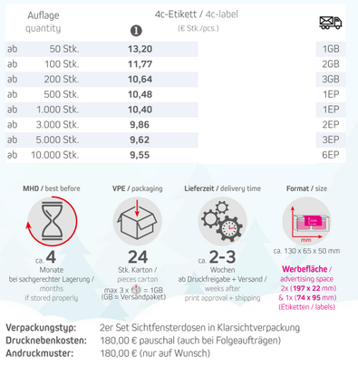 Werbefläche: 2 mal 197x22 + 74x95 mm, Werbeanbringung als Etikett in 4c individuell bedruckbar.