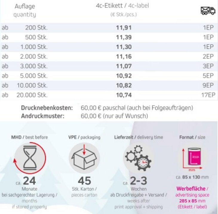 Dieser aromatische Früchtetee sorgt für wohlige Wärme an kalten Tagen. Die fruchtige Note von Orangenschalen kombiniert mit einer feinen Schärfe aus Ingwer und Chili macht ihn zum perfekten Begleiter für gemütliche Abende. Ein stimmungsvolles Werbemittel, das Genuss und Entspannung vermittelt – ideal als Giveaway in der Winterzeit.Inhalt: Kaminfeuer Tee: Hibiskusblüten, Ingwer, Hagebuttenschalen, Apfel, Karotten, Orangenschalen, natürliches Aroma, Lemongras, Kornblumenblüten, Chillies.Füllvarianten: siehe Bilder. Bitte Artikelnummer bei Bestellung mit angeben.Haltbarkeit: 24 Monate bei sachgerechter LagerungNetto-Gewicht: ca. 150g. Verpackungstyp: MetalldoseFormat: Keksdose Maxi 85 x 130 mmWerbefläche: 285 x 85 mmLieferzeit: ca. 2-3 Wochen ab Druckfreigabe + VersandDruckart: DigitaldruckMindestmenge: 200 Stück