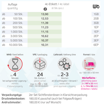 Werbefläche: 2 mal 197x22 + 74x95 mm, Werbeanbringung als Etikett in 4c individuell bedruckbar.Verpackung: Metalldose Mini mit Sichtfenster im 2er Set in KlarsichtsverpackungFormat: 130x65x50 mmLieferzeiten: 2-3 Wochen ab DruckfreigabeMindesthaltbarkeit: 4 MonateZutaten Knusper Weihnachtsset mit feuergebrannten Mandeln und Knusperkugeln im MIx: Knusperkugel-Mix: Zucker, Reismehl, Kakaobutter, Kakaomasse, VollMILCHpulver, Molkepulver (enthält MILCH), Laktose (aus MILCH), Malzextrakt (enthält GERSTE), Glasurmittel (E414), Emulgator (E322) SOJAlecithin, Salz, Natürliches Vanillearoma, MagerMILCHpulver ---- Feuergebrannte MANDELN: MANDELN, Zucker, Kakao, Vanillin, Zimt.