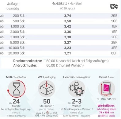 Inhalt: Kaminfeuer Tee: Hibiskusblüten, Ingwer, Hagebuttenschalen, Apfel, Karotten, Orangenschalen, natürliches Aroma, Lemongras, Kornblumenblüten, Chillies.Füllvarianten: Siehe Bilder. Artikelnummer bitte bei Bestellung mit angeben.Mindestmenge: 200 Stk.Haltbarkeit: ca. 24 Monate bei sachgerechter LagerungNetto-Gewicht: ca. 50gVerpackungstyp: Midi-Standbeutel aus Kraft-Papier schwarzFormat:ca. 185 x 110 mmWerbefläche: 4c-Etikett B 74 x H 105 mmLieferzeit: ca. 10 Arbeitstage ab Druckfreigabe + Versand