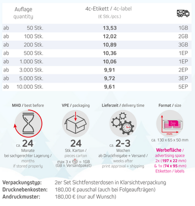 Werbefläche: 2 mal 197x22 + 74x95 mm, Werbeanbringung als Etikett in 4c individuell bedruckbar.