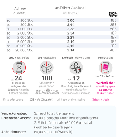Produkt: Mini Standbeutel / Kraftpapier braun Inhalt Varianten: 12g Schwarztee, Art.-Nr. 0158915g Kräutertee Harmonie, Art.-Nr. 0265915g Matetee Orange, Art.-Nr. 0266111g Kräutertee Lavendel, Art.-Nr. 0266211g Kräutertee Bergtee & Zietrone, Art.-Nr. 0266312g Bio Grüner Tee mit Minze, Art.-Nr. 0123117g Bio Früchtetee Gute Laune, Art.-Nr. 0030710g Bio Kräutertee Vierjahrszeiten, Art.-Nr. 0031015g Bio Kräutertee Glücksgefühl, Art.-Nr. 0122920g Bio Rotbuschtee Entspannungszeit, Art.-Nr. 0265812g Bio Kräutertee Seelenwohl, Art.-Nr. 02660Format: ca. 140 x 85 mmWerbefläche: 4c-Etikett 64 x 85 mm - Bitte Standskizze anfordern!Lieferzeit: ca. 12 Arbeitstage ab Druckfreigabe + VersandVPE: 100 Stk. / KartonHaltbarkeit: ca. 24 Monate bei sachgerechter LagerungMindestbestellmenge: 200 Stck.