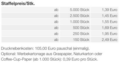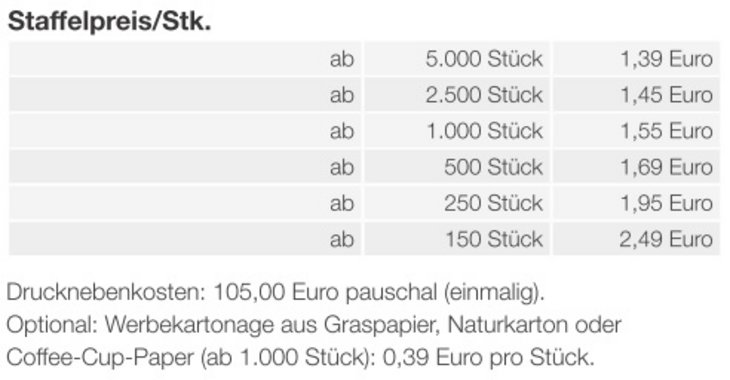 Die perfekte Erfrischung! VILSA Carat naturelle ist die perfekte Lösung für die Erfrischung zwischendurch. Mit ihrer Leichtigkeit und Wiederverschließbarkeit ist die Kartonverpackung das perfekte Präsent. Die Werbekartonage ist rundum individuell mit Ihrer Werbung bedruckbar. Für jede Bestellung mit uns wird ein Baum über GROW MY TREE gepflanzt. Wir verwenden FSC® zertifizierten Karton aus nachhaltiger Forstwirtschaft und anderen kontrollierten Quellen. Produktdetails: VILSA Bio Mineralwasser Naturelle verpackt in einer individuellen Werbekartonage.Bedruckung: 4-farbiger Druck auf grafischem Premium-Karton (FSC ® -zertifiziert). Optional auf Graspapier, Naturkarton oder Coffee-Cup-PaperFormat: ca. 70 x 63 x 168 mmInhalt: 1 VILSA Bio Mineralwasser naturelle im Tetra Pak 0,5 Haltbarkeit Lorenz: 12 Monate.Lieferzeit/Zubehör: ca.15 Arbeitstage nach Druckfreigabe.Mindestbestellmenge: 250 Stück