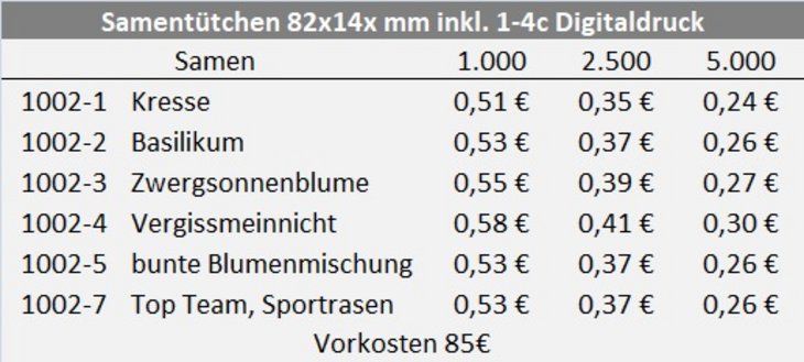 Preisliste Samentütchen 82x14x mm inkl. 1-4c Digitaldruck