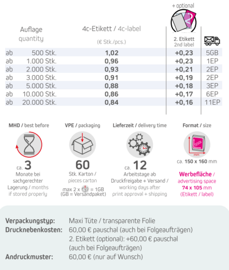Produkt: Maxi Tüte / transparente FolieInhalt: salziges Popcorn 10gFormat: ca. 150 x 160 mmWerbefläche: 4c-Etikett 74 x 105 mmOptional: 2. Etikett möglich!Lieferzeit: ca. 12 Arbeitstage ab Druckfreigabe + VersandVPE: 60 Stk. / KartonHaltbarkeit: ca. 3 Monate bei sachgerechter LagerungMindestbestellmenge: 500 Stück