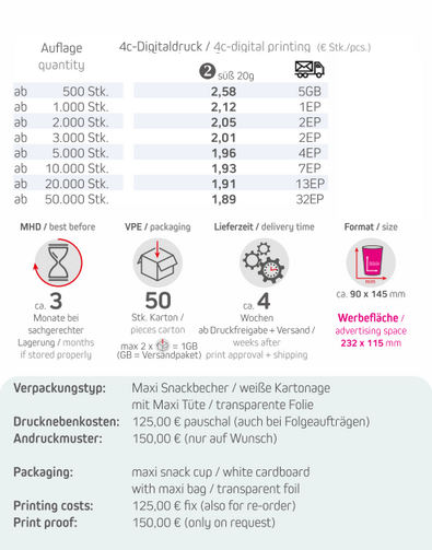 Verpackungstyp: Maxi Snackbecher / weiße Kartonage mit Maxi Tüte / transparente FolieInhalt: 20g süßes PopcornFormat: ca. 90 x 145 mmDruck: 4c-Digitaldruck auf Snackbecher rundumWerbefläche: Snackbecher: 232 x 115 mmLieferzeit: ca. 4 Wochen ab Druckfreigabe + VersandVPE: 50 Stk. / KartonHaltbarkeit: ca. 3 Monate bei sachgerechter LagerungMindestbestellmenge: 500 Stück