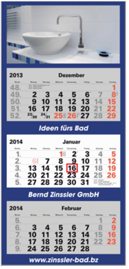 Kalendarium 3 Kalenderblöcke auf Rückwand montiert, deutsches Kalendarium mit roten Sonn- und Feiertagen, 1-sprachige Tages- und Monatsnamen (D), europäische Feiertage als Länderkennzeichen (A, B, CH, D, E, F, GB, I, NL, PL), ausführliche Feiertagsbezeichnungen für D, A, CH
