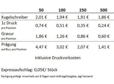Drehkugelschreiber von senator® Arvent Glossy. Allzeit beliebtes Werbemittel, individuell bedruckbar mit ihrem Logo oder Motiv! Hochwertiges Design zu einem wettbewerbsfähigen Preis.Schaft: Metall, glänzend lackiertBeschlagteile: Metall, glänzend verchromtFarben: in 2 verschiedenen Farben erhältlich, siehe AbbildungAusgestattet mit: magic flow G2 Mine (1,0 mm)Schreiblänge: bis zu 5.000 mSchreibfarbe: blau bzw. schwarz schreibendDruckbereiche:Schaft: (1*) 1c – 5c-Druck 35 x 15 mm, (2) Gravur 35 x 5 mm, (3) 1c – 5c-Druck 50 x 11 mm oder (4) Gravur 50 x 5 mm*Nummern markieren Druckstelle ( in Druckstandskizze einsehbar )Mindestbestellmenge: 50 StückLieferzeit: ca. 12 Arbeitstage ab Druckfreigabe
