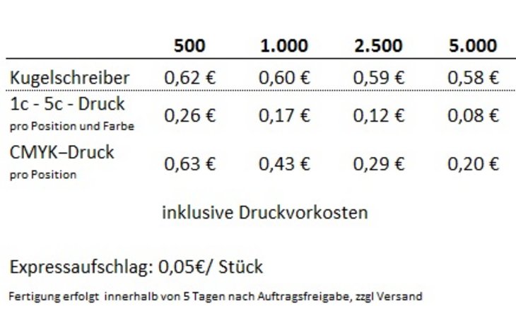 Material: KunststoffBeschreibung: Glänzend transparente Gehäuseoberfläche, farbige Softgriffzone passend zum SchaftFarben: In 14 verschiedenen Farben erhältlich, siehe AbbildungAusgestattet mit: magic flow G2 Mine (1,0 mm)Schreiblänge: bis zu 5.000 mSchreibfarbe: blau bzw. schwarz schreibendDruckbereiche:Clip: (*1) 1c – 5c-Druck CMYK-Druck 35 x 7 mmSchaft: (2) 1c – 5c-Druck 30 x 20 mm, (3) 1c – 5c-Druck 35 x 12 mm, (4) CMYK-Druck 60 x 7 mm oder (5) 1c – 5c-Druck 50 x 35 mm (ab 1.000 Stück)*Nummern markieren Druckstelle ( in Druckstandskizze einsehbar )Mindestbestellmenge: 500 StückLieferzeit: ca. 12 Arbeitstage ab DruckfreigabeMade in GermanyProduziert mit Ökostrom