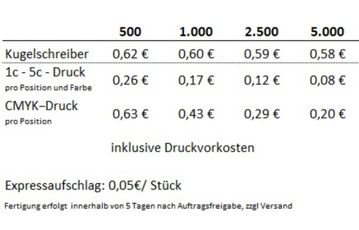 Material: Kunststoff Farben: In 10 verschiedenen Farben erhältlich, siehe AbbildungBeschreibung: Poliert opake Gehäuseoberfläche, weißer Schaft, Clip und Softgriffzone farbig, Ausgestattet mit: magic flow G2 Mine (1,0 mm)Schreiblänge: bis zu 5.000 mSchreibfarbe: blau bzw. schwarz schreibendDruckbereiche:Clip: (1) 1c – 5c-Druck CMYK-Druck 35 x 7 mmSchaft: (2) 1c – 5c-Druck 30 x 20 mm, (3) 1c – 5c-Druck 35 x 12 mm, (4) CMYK-Druck 60 x 7 mm, (5) 1c – 5c-Druck 50 x 35 mm (ab 1.000 Stück), (6) CMYK-Druck 60 x 35 mm (ab 1.000 Stück)*Nummern markieren Druckstelle ( in Druckstandskizze einsehbar )Mindestbestellmenge: 500 StückLieferzeitraum: ca. 12 Arbeitstage ab DruckfreigabeMade in GermanyProduziert mit Ökostrom