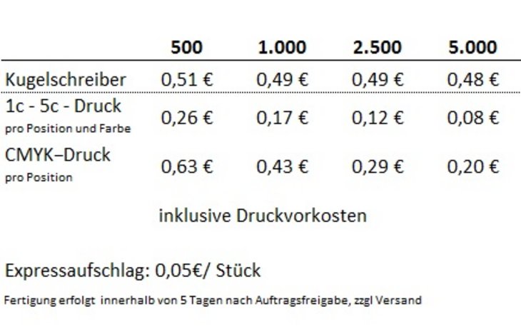 Material: KunststoffBeschreibung: Poliert opake Gehäuseoberfläche, senator®Ausgestattet mit: magic flow G2 Mine (1,0 mm)Schreiblänge: bis zu 5.000 mFarben: In 15 verschiedenen Farben erhältlich, siehe AbbildungSchreibfarbe: blau bzw. schwarz schreibendDruckfläche:Clip: (1) 1c – 5c-Druck oder CMYK-Druck 35 x 7 mmSchaft: (2) 1c – 5c-Druck 45 x 20 mm, (3) 1c – 5c-Druck 50 x 12 mm, (4) CMYK-Druck 80 x 7 mm oder (5) 1c – 5c-Druck oder CMYK-Druck auf weißem Schaft 60 x 35 mm (ab 1.000 Stück)*Nummern markieren Druckstelle ( in Druckstandskizze einsehbar )Mindestbestellmenge: 500 StückLieferzeit: ca. 12 Arbeitstage ab DruckfreigabeMade in GermanyProduziert mit Ökostrom
