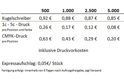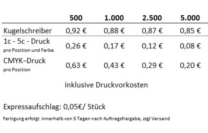 Material: KunststoffBeschreibung: Samtige Gehäuseoberfläche, transparenter ClipFarben: In 9 verschiedenen Farben erhältlich, siehe AbbildungAusgestattet mit: magic flow G2 Mine (1,0 mm)Schreiblänge: bis zu 5.000 mSchreibfarbe: blau bzw. schwarz schreibendDruckbereiche:Clip: (*1) 1c – 5c-Druck CMYK-Druck 35 x 7 mmSchaft: (2) 1c – 5c-Druck 60 x 35 mm (ab 1.000 Stück)*Nummern markieren Druckstelle ( in Druckstandskizze einsehbar)Mindestbestellmenge: 500 StückLieferzeite: ca. 37 Arbeitstage ab Druckfreigabe bei Schaft und ca. 17 Arbeitstage bei ClipMade in GermanyProduziert mit Ökostrom