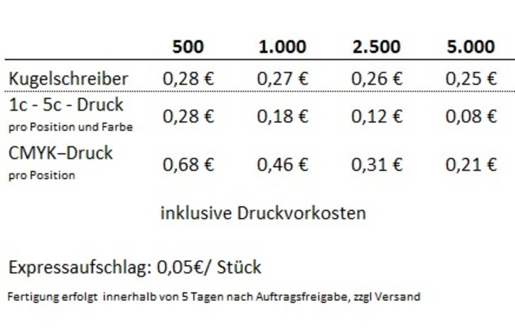 Material: KunststoffAusgestattet mit: Premium-"Magic Flow" X20 Mine (1,0 mm)Schreiblänge: bis zu 2.000 mFarbe: In 15 verschiedenen Farben erhältlich, siehe AbbildungSchreibfarbe: blau bzw. schwarz schreibendDruckbereiche:Clip: (1) 1c – 5c-Druck oder CMYK-Druck 20 x 6 mmSchaft: (2) 1c – 5c-Druck 35 x 20 mm, (3) 1c – 5c-Druck 65 x 12 mm oder (4) CMYK-Druck 60 x 7 mm*Nummern markieren Druckstelle ( in Druckstandskizze einsehbar )Mindestbestellmenge: 500 StückLieferzeit: ca. 12 Arbeitstage nach DruckfreigabeMade in GermanyProduziert mit Ökostrom