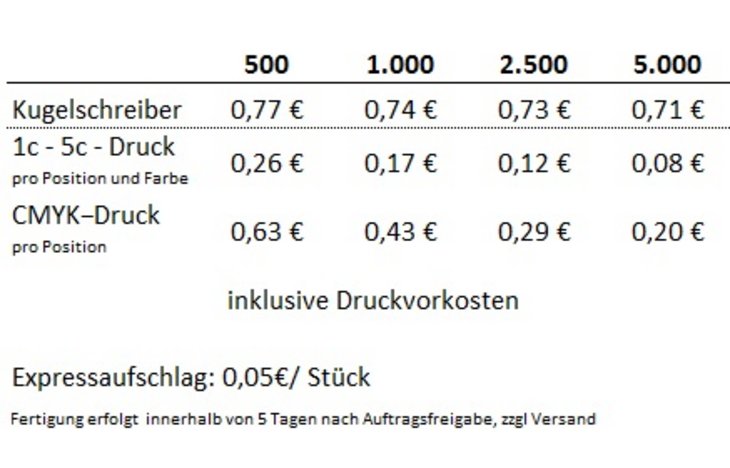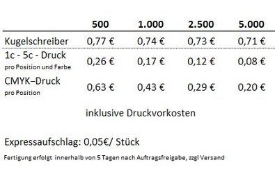 Material: Kunststoff Ausgestattet mit: magic flow G2 Mine (1,0 mm)Schreiblänge: bis zu 5.000 mFarben: In 9 verschiedenen Farben erhältlich, siehe AbbildungSchreibfarbe: blau bzw. schwarz schreibendDruckfläche:Kappe: (1) CMYK-Druck Ø 9,5 mmClip: (2) 1c – 5c-Druck oder CMYK-Druck 35 x 7 mmSchaft: (3) 1c – 5c-Druck 60 x 30 mm (ab 1.000 Stück)*Nummern markieren Druckstelle ( in Druckstandskizze einsehbar )Mindestbestellmenge: 500 StückLieferzeit: ca. 12 Arbeitstage ab DruckfreigabeMade in GermanyProduziert mit Ökostrom