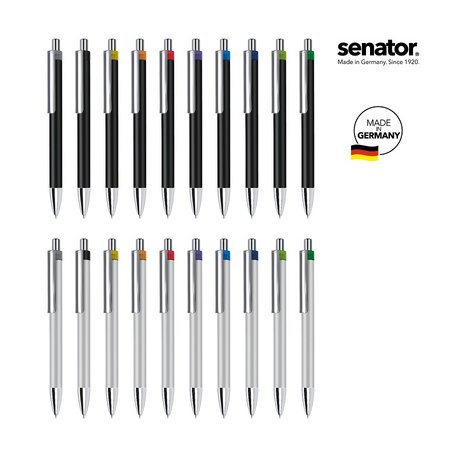 Druckkugelschreiber "Polar". Schaft: Metall, lackiert in 2 Farben erhältlich: schwarz und silber Die Farbapplikation ist in 10 unterschiedlichen Farben erhältlich. Beschlagteile: Metall, glänzend verchromt. Senator Magic Flow Metallmine, Minentyp: G2, Schreibfarbe: blau oder schwarz.Schaft: Metall, lackiert in 2 Farben erhältlich schwarz oder silberBeschlagteile: Metall, glänzend verchromtFarbe: In 10 verschiedenen Farben erhältlich, siehe AbbildungAusgestattet mit: magic flow G2 Mine (1,0 mm)Schreiblänge: bis zu 5.000 mSchreibfarbe: blau bzw. schwarz schreibendDruckbereiche:Clip: (*1) Gravur 45 x 6 mmSchaft: (2) 1c – 5c-Druck 40 x 16 mm, (3) Gravur 45 x 5 mm, (4) 1c – 5c-Druck 55 x 11 mm oder (5) Gravur 60 x 5 mm*Nummern markieren Druckstelle ( in Druckstandskizze einsehbar )Mindestbestellmenge: 50 StückLieferzeit: ca. 12 Arbeitstage ab DruckfreigabeMade in GermanyProduziert mit Ökostrom