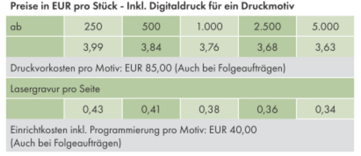 Veredelung: Digitaldruck, 4/0-c-Euroskala auf Papierbanderole und Lasergravur auf Holz (optional)