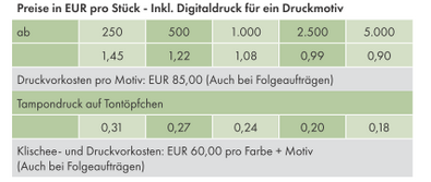 Druck: Digitaldruck, 4/0-c-Euroskala und/oder Tampondruck auf Tontöpfchen