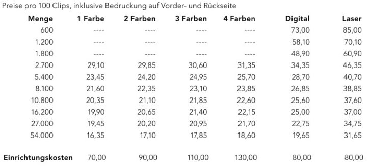 Preisliste Wingclip mit Druck auf beiden Seiten