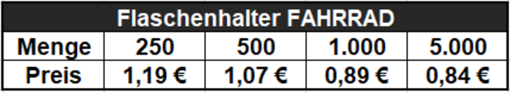 Flaschenhalterung, passend für jedes Fahrrad.Mit zwei individuell verstellbaren Befestigungsschlaufen.Material: Kunststoff/PolypropylenGewicht: 28gAbmessungen (mm): 75 x 90 x 140Verpackungseinheit: 80 Stk.Werbedruck: TampondruckDruckfläche: Ø: 20.00Maximale Druckfarben: 5Farben: schwarz, Standard-blau PP, Standard-gelb, Standard-grün, WeißMADE IN GERMANY******Artikel nicht mehr lieferbar*******