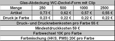 Preisliste Glasabdeckung mit Clip WC mit Logo