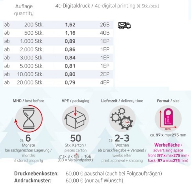Bringen Sie eine kleine festliche Freude in Ihr Büro oder Meeting mit unseren Mini Schoko-Weihnachtsmännern! Der beliebte Klassiker aus feinster Vollmilchschokolade ist ein charmanter und köstlicher Gruß vom Nikolaus. Ob als kleines Extra in den Meeting-Unterlagen oder als süßes Giveaway – diese kleinen Schokoladen-Weihnachtsmänner sorgen garantiert für ein Lächeln auf den Gesichtern Ihrer Kollegen oder Kunden. Ideal für die bevorstehenden Feiertage oder als süße Geste für Ihre Geschäftspartner – mit den Mini Schoko-Weihnachtsmännern bleibt Ihre Werbung geschmackvoll in Erinnerung.Inhalt: Mini Schoko-Weihnachtsmann 7g aus Edel-Vollmilch-Schokolade (Kakao: 33% mindestens)Haltbarkeit: ca. 6 Monate bei sachgerechter LagerungVerpackungstyp: Mini Schoko-Weihnachtsmann geklebt auf Türhänger Format: ca. 100 x 210 mmWerbefläche: Türhänger komplett rundum (gemäß Standskizze)Lieferzeit: ca.2-3 Wochen ab Druckfreigabe + VersandDruckart: DigitaldruckMindestmenge: 200 StückZutaten Mini Schoko-Weihnachtsmänner: Zucker, VollMILCHpulver, Kakaobutter, Kakaomasse, Emulgator Lecithine (SOJA), Bourbon-Vanille-Extrakt. Kann Spuren von HASELNÜSSE und MANDELN enthalten.Nährwerte pro 100g: Energie: 2257 kJ / 541 kcal, Fett: 34 g, davon gesättigte Fettsäuren: 21 g, Kohlenhydrate: 49 g, davon Zucker: 48 g, Eiweiß: 8,7 g, Salz: 0,25 g