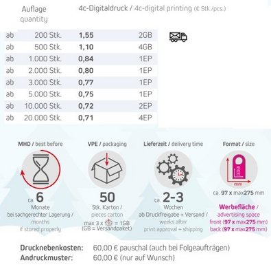 Süße Werbung von Herzen mit Schoko-Herzen! Diese zarten Edel-Vollmilch-Schokoladenherzen sind der perfekte Begleiter für jeden Anlass. Ob als kleine Aufmerksamkeit bei Events oder als liebevolles Giveaway für Ihre Kunden – die Schoko-Herzen sorgen für ein unvergessliches Geschmackserlebnis. Mit ihrem schokoladigen Charme und der herzlichen Form bringen sie Ihre Marke auf eine ganz besondere Weise ins Gespräch. Verschenken Sie Liebe und lassen Sie Ihre Werbung auf süße Weise im Gedächtnis bleiben! Ideal für alle, die ihrer Werbebotschaft ein wenig Herz und viel Genuss verleihen möchten. Ein süßer Moment, der gerne geteilt wird.Inhalt: Edel-Vollmilch-Schokolade (Kakao: 33% mindestens) Zucker, Kakaobutter, Vollmilchpulver, Kakaomasse, Emulgator: Sojalecithine; Bourbon Vanilleextrakt. Kann Spuren von Haselnüssen und Erdnüssen enthalten.Haltbarkeit: ca. 6 Monate bei sachgerechter LagerungVerpackungstyp: Schoko-Herz geklebt auf Türhänger Format: ca. 97 x 275 mmWerbefläche: Türhänger komplett rundum (gemäß Standskizze)Lieferzeit: ca.2-3 Wochen ab Druckfreigabe + VersandDruckart: 4c DigitaldruckMindestmenge: 200 StückZutaten Schoko-Herzen: Edel-VollMILCH-Schokolade (Kakao: 33% mindestens) Zucker, Kakaobutter, VollMILCHpulver, Kakaomasse, Emulgator: SOJAlecithine, Bourbon Vanilleextrakt. Kann Spuren von HASELNÜSSEn und ERDNÜSSEn enthalten.Nährwerte pro 100g: Energie: 2353 kJ / 565 kcal, Fett: 36 g, davon gesättigte Fettsäuren: 22 g, Kohlenhydrate: 53 g, davon Zucker: 53 g, Eiweiß: 6,7 g, Salz: 0,23 g