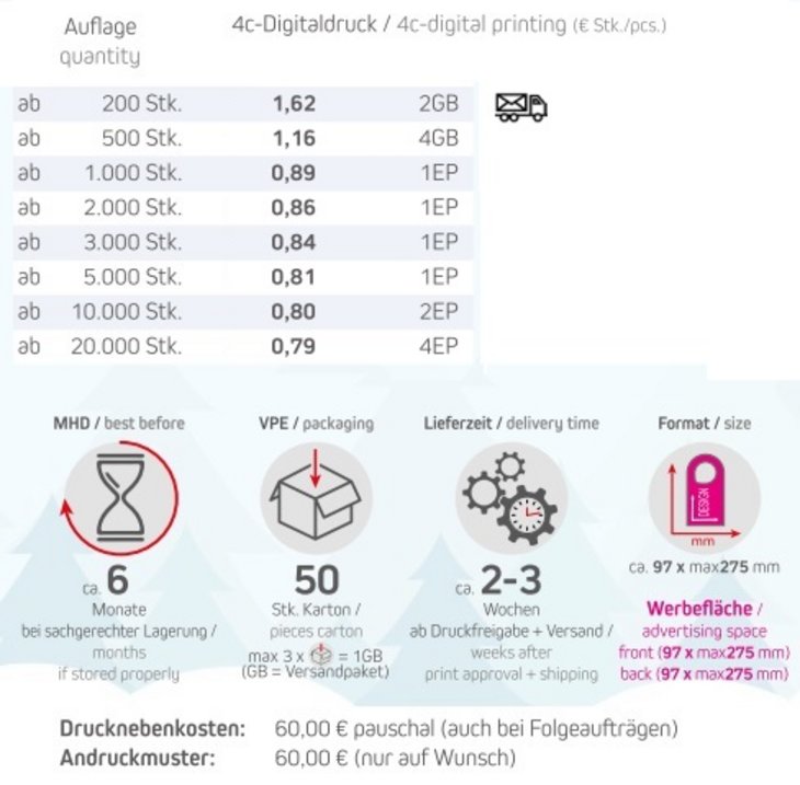 Bringen Sie weihnachtliche Freude mit unserem Schoko-Weihnachts Mix! Dieser Mix aus vier liebevoll gestalteten Schokoladenfiguren – Nikolaus, Weihnachtsmann, Schneemann und Rentier – sorgt für eine festliche Stimmung und lässt die Vorfreude auf die Feiertage wachsen. Ideal als Giveaway oder kleines Geschenk für Ihre Kunden, Kollegen und Gäste!Inhalt: Edel-Vollmilch-Schokolade (Kakao: 33% mindestens) Zucker, Kakaobutter, Vollmilchpulver, Kakaomasse, Emulgator: Sojalecithine; Bourbon Vanilleextrakt. Kann Spuren von Haselnüssen und Erdnüssen enthalten.Haltbarkeit: ca. 6 Monate bei sachgerechter LagerungVerpackungstyp: Schoko-Weihnachts Mix geklebt auf Türhänger Format: ca. 100 x 275 mmWerbefläche: Türhänger komplett rundum (gemäß Standskizze)Lieferzeit: ca.2-3 Wochen ab Druckfreigabe + VersandDruckart: DigitaldruckMindestmenge: 200 StückZutaten Schoko-Weihnachts Mix: Edel-VollMILCH-Schokolade (Kakao: 33% mindestens) Zucker, Kakaobutter, VollMILCHpulver, Kakaomasse, Emulgator: SOJAlecithine, Bourbon Vanilleextrakt. Kann Spuren von HASELNÜSSEn und ERDNÜSSEn enthalten.Nährwerte pro 100g: Energie: 2353 kJ / 565 kcal, Fett: 36 g, davon gesättigte Fettsäuren: 22 g, Kohlenhydrate: 53 g, davon Zucker: 53 g, Eiweiß: 6,7 g, Salz: < 0,23 g