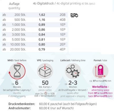 Verleihen Sie Ihrer Weihnachtsdekoration oder den Geschenken das gewisse Etwas! Diese kleinen Vollmilchschokoladen-Bärchen im festlichen Kostüm sind ein charmanter Hingucker und versüßen jede Feier. Ideal für Ihre Weihnachtsaktionen oder als süßes Giveaway für Ihre Kunden und Partner.Inhalt: Edel-Vollmilch-Schokolade (Kakao: 33% mindestens) Zucker, Kakaobutter, Vollmilchpulver, Kakaomasse, Emulgator: Sojalecithine; Bourbon Vanilleextrakt. Kann Spuren von Haselnüssen und Erdnüssen enthalten.Haltbarkeit: ca. 6 Monate bei sachgerechter LagerungVerpackungstyp: Schoko-Weihnachtsbärchen geklebt auf Türhänger Format: ca. 100 x 275 mmWerbefläche: Türhänger komplett rundum (gemäß Standskizze)Lieferzeit: ca.2-3 Wochen ab Druckfreigabe + VersandDruckart: DigitaldruckMindestmenge: 200 StückZutaten Schoko-Weihnachtsbärchen: Edel-VollMILCH-Schokolade (Kakao: 33% mindestens) Zucker, Kakaobutter, VollMILCHpulver, Kakaomasse, Emulgator: SOJAlecithine, Bourbon Vanilleextrakt. Kann Spuren von HASELNÜSSEn und ERDNÜSSEn enthalten.Nährwerte pro 100g: Energie: 2353 kJ / 565 kcal, Fett: 36 g, davon gesättigte Fettsäuren: 22 g, Kohlenhydrate: 53 g, davon Zucker: 53 g, Eiweiß: 6,7 g, Salz: < 0,23 g