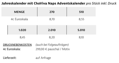 Preisliste Jahreskalender mit Adventskalender ChoViva Naps ECO mit Logo