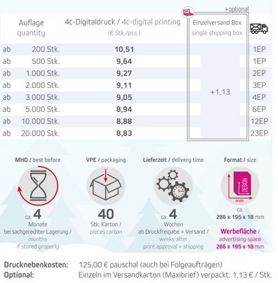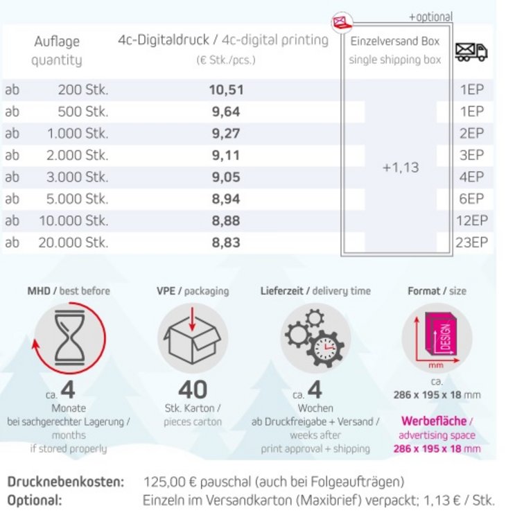 Adventskalender Midi Faltschachtel. Werbeanbringung als Direktdruck in 4c individuell bedruckbar.Holen Sie den goldenen Stern vom Himmel und machen Sie Marzipanliebhabern eine ganz besondere Freude! Diese zarten Lübecker Marzipansterne sind das perfekte Geschenk für die Festtage und verzaubern mit ihrem feinsten Marzipangeschmack. Ideal als süßes Giveaway, das glänzend in Erinnerung bleibt. Verleihen Sie Ihrer Werbung einen Hauch von Luxus und Tradition!Artikel: Lübecker Marzipansterne 300g im Midi-AdventskalenderHaltbarkeit: ca. 4 Monate bei sachgerechter LagerungDruck: 4c Digitaldruck WerbekarteWerbefläche: 286x195x18 mmVerpackungstyp: Adventskalender im Versandkarton einzeln verpackt, Aufpreis 1,13 € / StückLieferzeit: ca. 3-4 Wochen ab DruckfreigabeMindestmenge: 200 StückZutaten Lübecker Marzipansterne: Zucker, MANDELN gemahlen(37%), Kakaomasse, Wasser, Kakaobutter, Emulgator: Lecithin (E 322), Feuchthaltemittel: Invertase (E 1103).Nährwerte pro 100g: Energie: 2035 kJ / 486 kcal, Fett: 29 g, davon gesättigte Fettsäuren: 7 g, Kohlenhydrate: 43 g, davon Zucker: 42 g, Eiweiß: 9,8 g, Salz: < 0,01 g