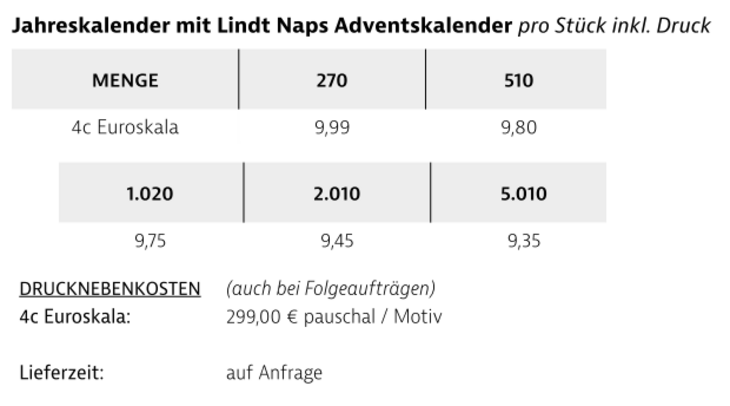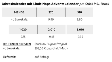 Preisliste Jahreskalender mit Lindt Adventskalender Naps ECO mit Logo