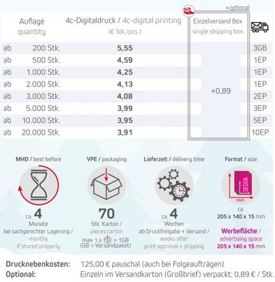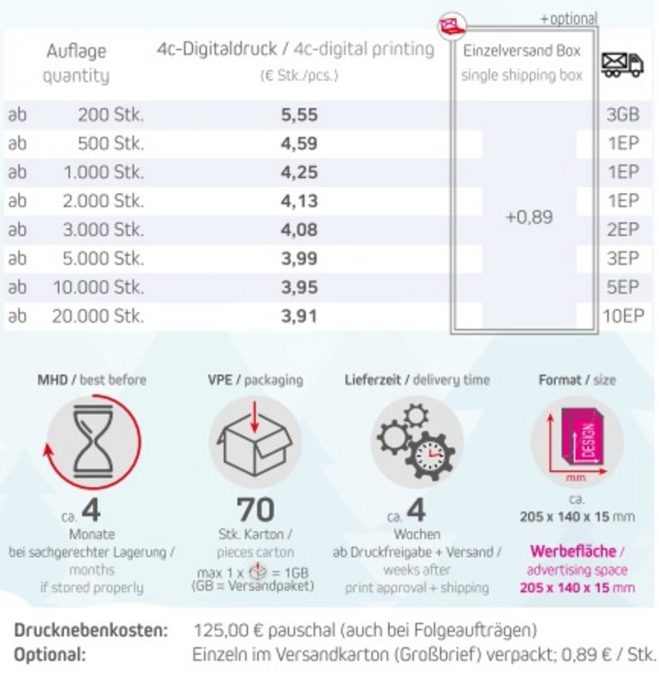 Preisliste Mandel-Schoko-Trio Mini Adventskalender mit Logo Details